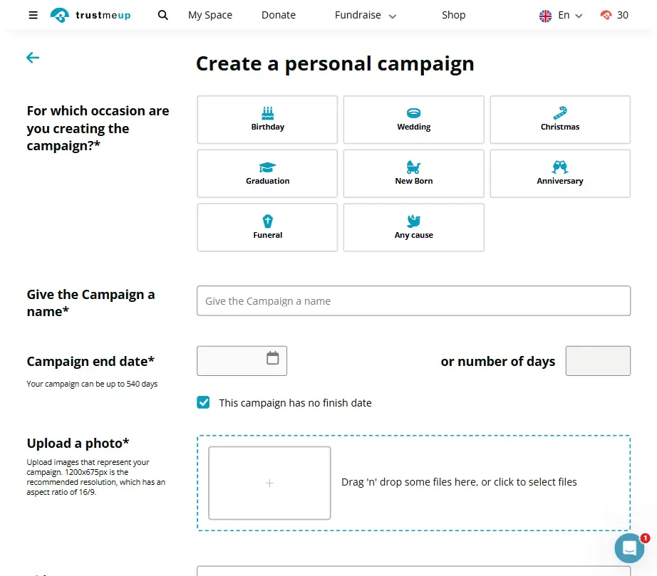 Create in 3 minutes – title, story, image, and goal.
