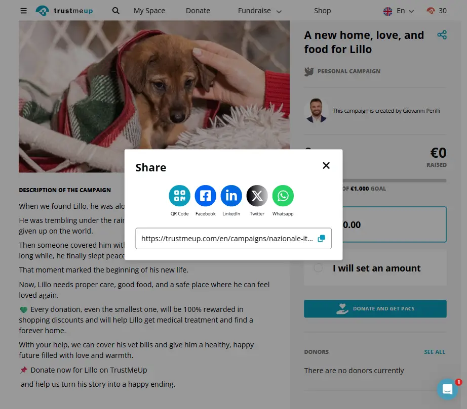 Each donation generates discounts equal to 100%, usable in the TrustMeUp e-commerce gallery.